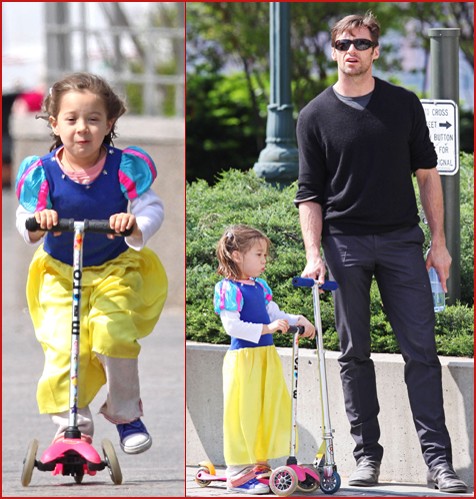 After done promo tour for X-Men Origins: Wolverine, the 40 year old actor, Hugh Jackman, has happily enjoyed his role as doting father. Treating his dressed up 3 ½ year old daughter Ava to an afternoon at a park in New York City today (May 11), action hero Hugh showed off his caring paternal side before meeting up with his wife Deborra-Lee Furness for a romantic stroll through the West Village. Big brother Oscar, 8 ½, was not join with them.
