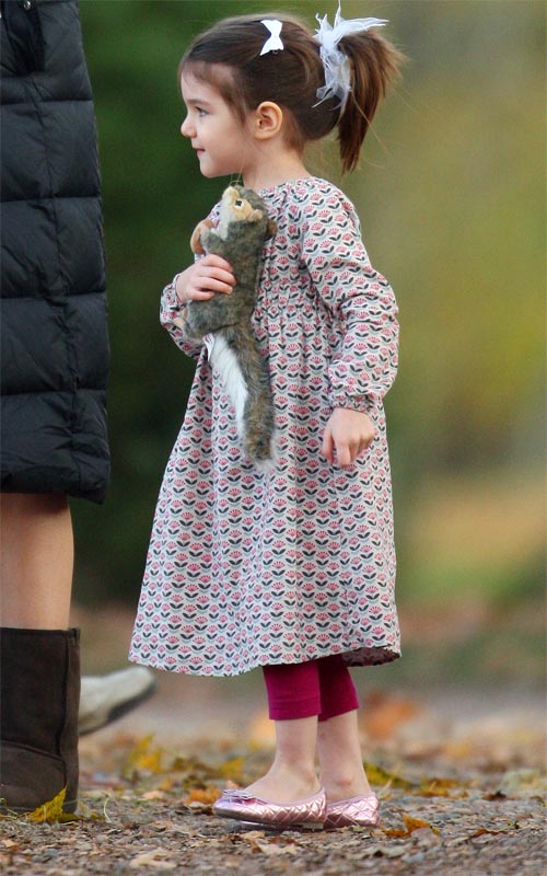 Suri with pony tail and sweet pink ribbon hairpin, she looks cute. Held on her stuffed animal she spent some fun time with mom and nanny on Katie Homes’ new film, The Romantic in Long Island New York.