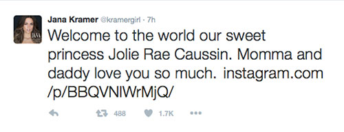 “Words can’t even begin to describe how much happiness I’m feeling right now,” Jana Kramer, 32, tells according People. “Holding my healthy and beautiful baby girl in my arms is something that’s truly indescribable. Michael and I are so thankful for this wonderful blessing!”